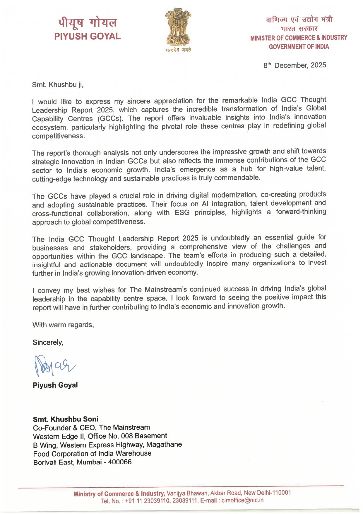Commenting on the report, Shri Piyush Goyal, Union Minister of Commerce and Industry, Government of India said, “We appreciate the India GCC Thought Leadership Report 2025 for its insightful portrayal of the crucial role Global Capability Centres play in strengthening India’s innovation ecosystem. The report clearly highlights how GCCs have evolved into strategic hubs driving digital transformation, advanced technologies and high-value talent development. Their growing contribution to global competitiveness and economic growth reinforces India’s position as a preferred destination for innovation-led enterprises and future-ready global organizations”
